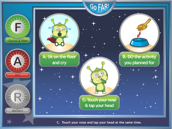 This Practice Games allow your child to practice the steps of FAR (Focus and Plan/Act/Reflect) in quick, easy, game-like stages. It is recommended that you complete the sequence in the order listed in this section, even if only once. Play order for your child should be:
