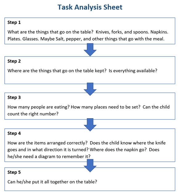 After you analyze the task, find out if the child understands all these steps. If not, then teach the child what he/she needs to know and what questions to ask. (Are you having soup? Then you need a soup spoon.)