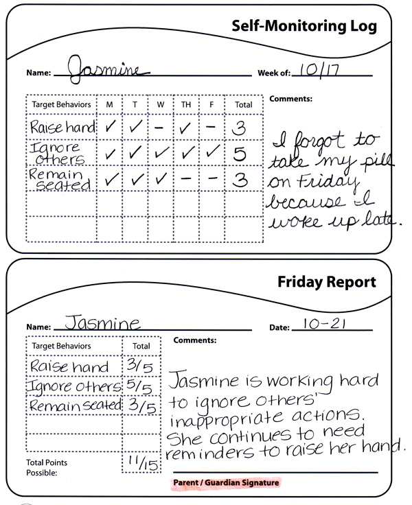 Allow students to monitor their own behavior with this form. List the target behaviors then allow the student to check it off daily. Send the Friday report home for the Parents to sign.