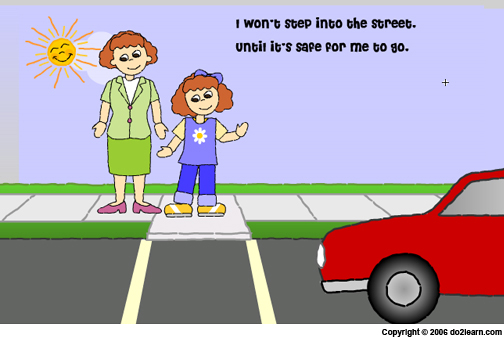 I won't step into the street 'til it's safe for me to go. When there are no moving cars, I can cross but first I know