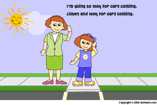 I'm going to look for cars coming. Listen and look for cars coming. I won't cross with cars coming, 'cause that's not safe for me.