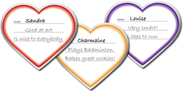 - Distribute the hearts to the class; no student should receive the heart with their own name on it.