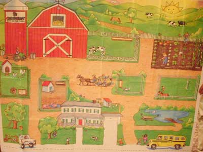 Example of a plastic 4 foot by 5 foot floor mat of a farmyard.