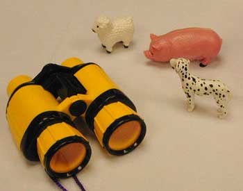 Round up some animal play pieces, a pair of child's binoculars, and a floor mat of a farmyard.
