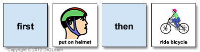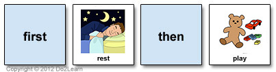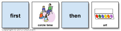 These strips are helpful in teaching the important concept of "first" and "then". Initially, you can make a cardboard form by writing the word "first", placing a picture card, writing the word "then", and placing a second picture card. Once the vocabulary and concept have been learned, you can simply present the two picture cards and explain: "First we need to pick your sister up at school, then we can stop at McDonald's."