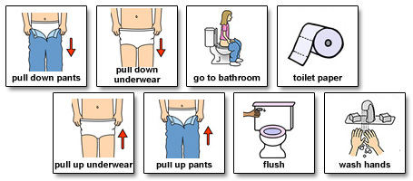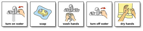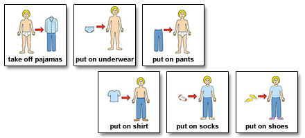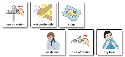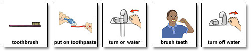 These are shorter strips that help to remind someone how to perform a particular sequence. Sequences can include anything an individual seems unable to remember without a visual cue. For example, place a tooth brushing routine above the sink, or a toileting sequence next to the toilet.