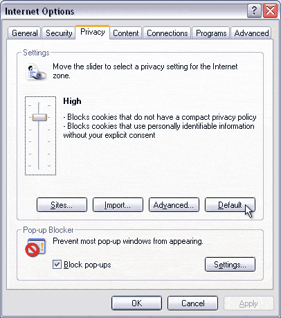 Cookie SettingsOur site requires cookies enabled to verify subscription log in information between pages on our site. If the cookie settings in your Internet Explorer browser are set to "High" or "Block All Cookies" you may not be able to advance beyond the log in page after entering your log in information. Below are three options for changing your browser settings to allow log in and subscription verification. Following any one of the three options below should adjust your settings to allow log in to MAS. Cookie settings in Internet Explorer can be accessed from the menu bar at the top of the window by selecting Tools > Internet Options... and then clicking on the "Privacy" tab. After changing cookies settings click the "OK" button on the bottom of the "Internet Options" dialog window, close the browser window and then reopen and try logging in again. 1. Use default Internet Explorer settings for handling cookies:If your setting for handling cookies is set to "High" or "Block All Cookies" you can change the settings to allow cookies and enable log in by simply clicking the "Default" button to change the browser settings back to the Microsoft default, as in the image below. Afterward the cookie settings slider bar will be at the "Medium" setting, as in the image below: