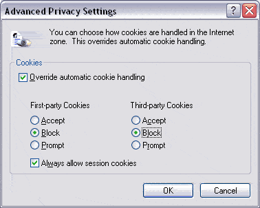 2. Allow session cookies:Click the "Advanced" button in the "Internet Options" dialog window and then check the "Override automatic cookie handling" and "Always allow session cookies" check boxes, as in the image below, and then click the "OK" button. The "First-party Cookies" and "Third-party Cookies" settings won't matter as long as session cookies are allowed.