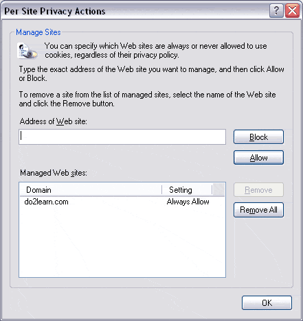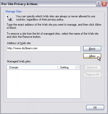 3. Add do2learn.com to sites trusted to use cookies:Click the "Sites" button in the "Internet Options" dialog window (this option is not available if you have the slider at the "Block All Cookies" setting). In the "Address of Web site:" text box, type in the address for do2learn.com, as in the image below (you can also simply type "do2learn.com", without the quotation marks). Then click the "Allow" button.